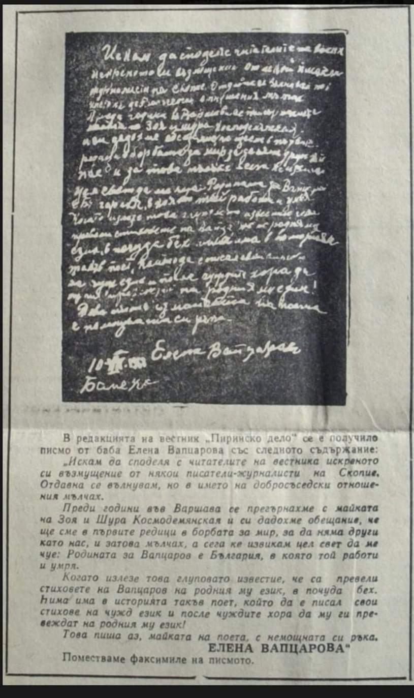 1. Майката на Никола Вапцаров (Елена) пише собственоръчно писмо, публикувано с факсимиле във вестник „Пиринско дело“, че родината за сина й е България и че родният му език е български.