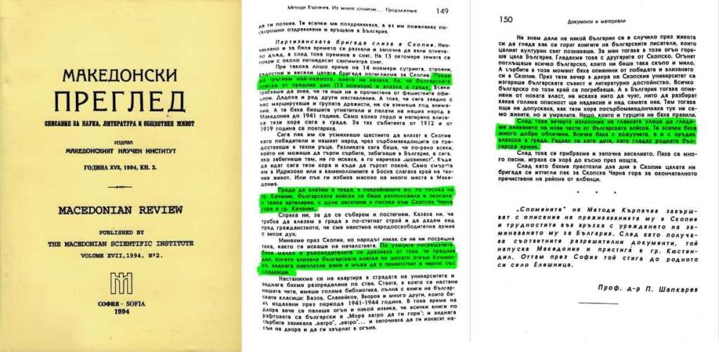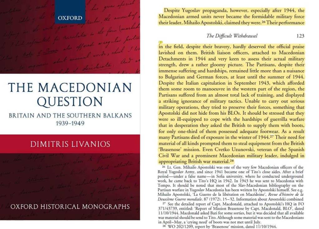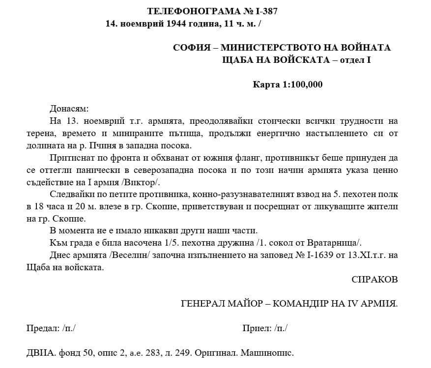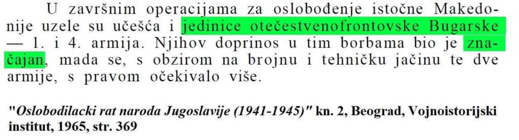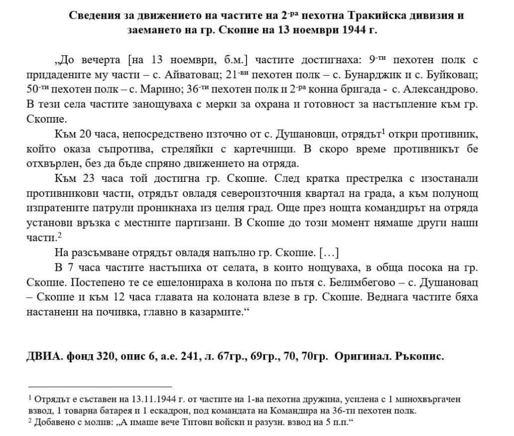 ). Както и по други теми това поведение на „историчарите“ в Скопие е продиктувано от политически съображения и не почива на действителни исторически данни. Благодарение на съществуващите телеграми, кореспонденции, дневници, както на български, така и на чуждестранни военни, участници във Втората световна война, можем да добием обективна представа и за тази част от историята.